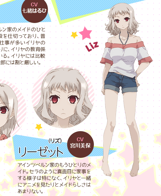 リーゼリット 同僚、姉妹機。何かとイリヤに意見する上に不真面目な彼女に若干苛ついている。 バーサーカー 主のサーヴァント。 衛宮士郎 イリヤに近づく悪い虫。 ユーブスタクハイト・フォン・アインツベルン 鋳造主。 間桐慎二セラ(CV七緒はるひ)、リーゼリット(CV宮川美保) のシングルやアルバムをダウンロード:ハイレゾならレコチョク(Android/iPhone対応 音楽アプリ) 伊藤静), セラ( CV七緒はるひ), リーゼリット( CV宮川美保) 品番 LACM142 税込価格(10%) 1,430円 税抜価格 1,300円 発売日 15年01月28日 レーベル Lantis 試聴する Comment 14年7月放送予定TVアニメ「Fate/kaleid liner プリズマ☆イリヤ2wei!」キャラクターソングシリーズが登場! 第3